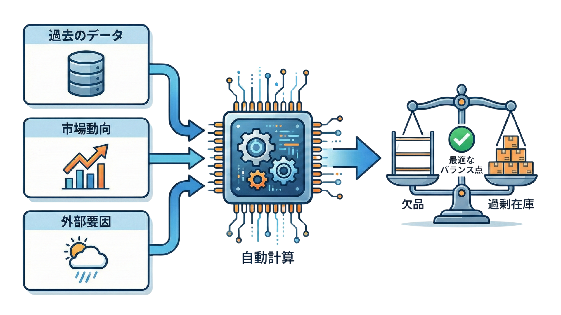 過去の販売実績に加え、天候、経済指標、競合の活動といった数多くの外部因子をAIが学習し、従来の統計モデルでは不可能だった高い精度で需要を予測します。